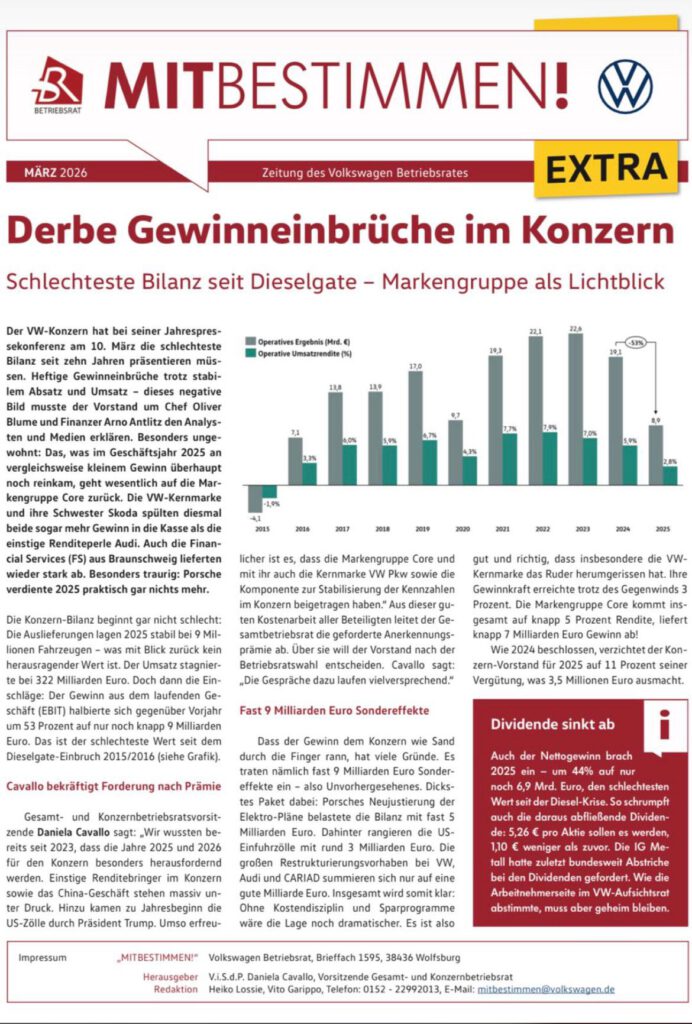 Der Betriebsrat hat noch am Tage der Jahrespressekonferenz sein Blättchen „Mitbestimmen!“ herausgegeben mit der schon zitierten Überschrift“ Derbe Gewinneinbrüche im Konzern.“ Das Blättchen liest sich wie eine Mitteilung des Unternehmens – bis hin zu den völlig überflüssigen Aussagen, der Konzernvorstand verzichte für 2025 auf 11 Prozent seiner Vergütung und die Dividende für die Aktionäre sinke auf 5,26 Euro pro Aktie. Wenn sie wenigstens dazu geschrieben hätten, dass Blume etwa 7 Millionen Euro Vergütung bekommt und dass die Familie Porsche und Piëch etwas mehr als 50 Prozent der Stimmrechtsaktien halten und ihnen daraus eine Dividendenzahlung von etwa eine Milliarde Euro überwiesen werden wird. Glaubt die Betriebsratsspitze wirklich, jemanden von den Arbeiterinnen und Arbeitern damit beeindrucken zu können? Oder dient es dazu, eben diese Arbeiterinnen und Arbeiter auf die nächste Sparrunde vorzubereiten? Aber das ist nicht Aufgabe des Betriebsrates. Seine Aufgabe wäre es vielmehr, im genannten Sinne für Transparenz zu sorgen und einfache betriebs- und volkswirtschaftliche Zusammenhänge sichtbar zu machen. Mit der Argumentation der Betriebsratsspitze geht sie einen Irrweg, gibt sie dem Management alle Argumente in die Hand, um noch mehr Jobs zu vernichten, um die Löhne weiter zu senken und die Arbeitszeit auszuweiten. Und ich frage mich, wer diese Betriebsratsspitze eigentlich berät – oder ob sie einfach nur vom Management abschreibt. Die Maßstäbe sind völlig versch(r)oben. Und der Betriebsrat hat Berater*innen, die das überhaupt nicht blicken. Dazu passt auch die unfassbare Position von Daniela Cavallo pro Rüstungsproduktion und ihre Aussage im Gespräch mit der HAZ vom 4. März 2026 zum nächsten drastischen Sparprogramm: „Klar ist auch, dass diese Effizienzprogramme nötig sind. Da gibt es keinen Dissens zwischen Arbeitnehmerseite und Vorstand.“ In schlechter paternalistischen Art promoteen Hubertus Heil und der Betriebsrat die Vorsitzende: „Daniela kämpft für Dich.“