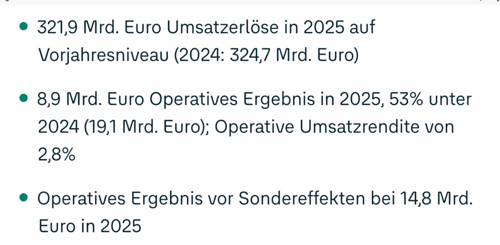 Trotz des Rückgangs erzielte Volkswagen im Jahr 2025 immer noch ein operatives Ergebnis von 8,9 Milliarden Euro, das sind 6,9 Milliarden Euro Gewinn nach Steuern. Davon werden 3,2 Milliarden Euro an die Aktionäre ausgeschüttet – eine Rendite von gut 6 Prozent. Allein der Porsche-Piëch-Clan erhält für das Geschäftsjahr 2025 mindestens eine Milliarde Euro.